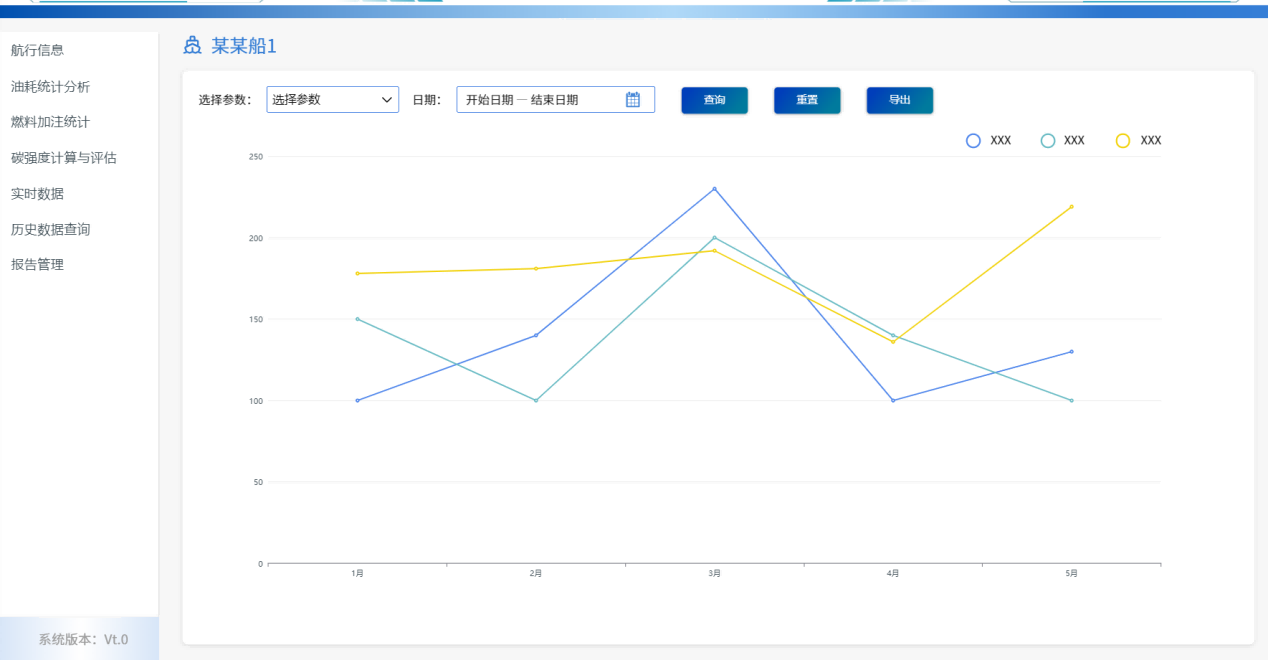 数据采集与在线监测需要对船舶液位遥测系统,以及船舶航行助航设备,如GPS系统、计程仪、AIS系统等进行监控。其中重点监测船舶油耗数据,对XX散货船的液位遥测系统中的燃油舱液位进行数据采集。并可查询及导出油耗记录数据。